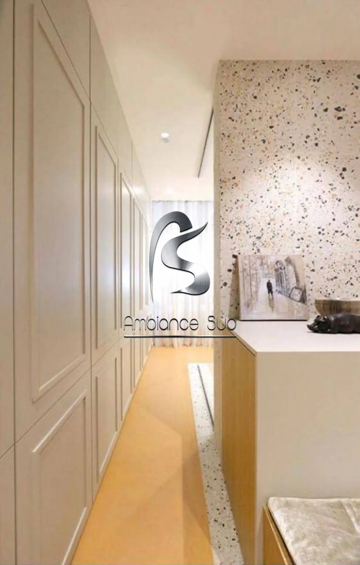 Ce superbe jaune doré lumineux personnalise l’intérieur de cette immense espace chambre d’adulte et donne une unité décorative parfaite, une ambiance cosy, chaleureuse et ensoleillée.