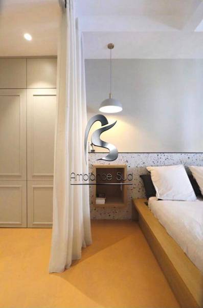Var Ambiance Sud, vous présente une superbe réalisation en béton ciré jaune doré pour une chambre d’adulte dans une maison du Lavandou, près de Toulon.