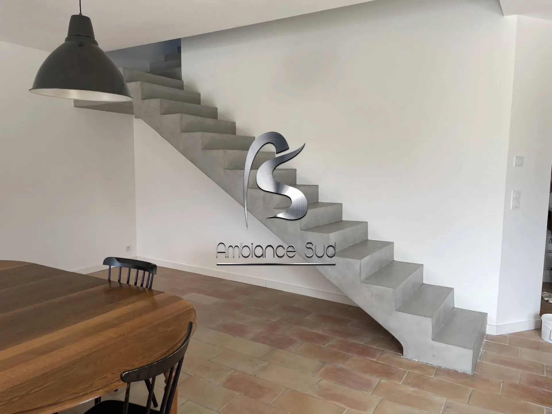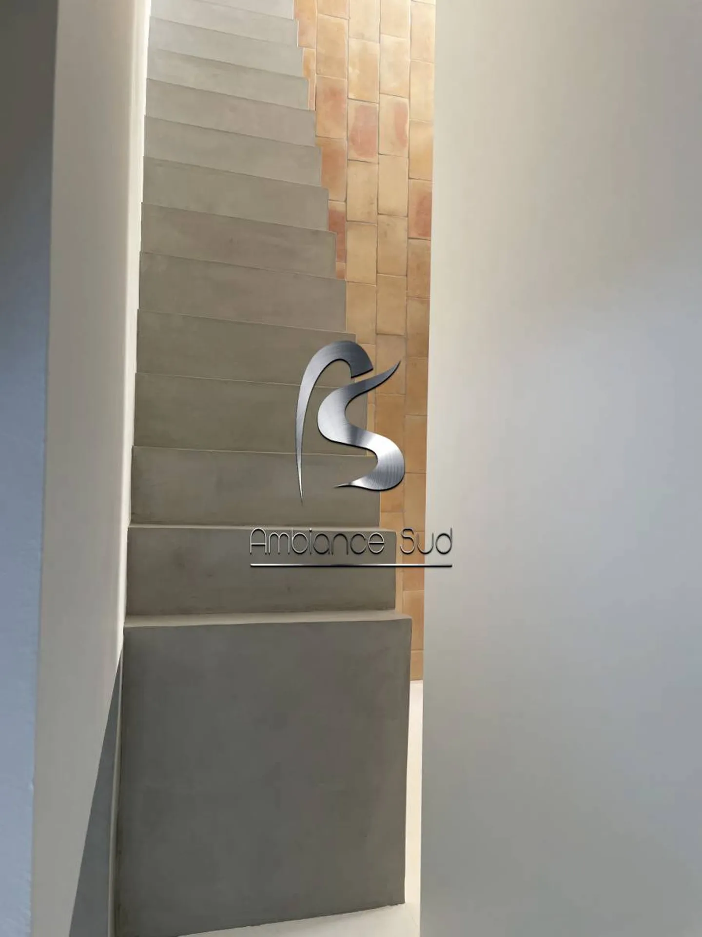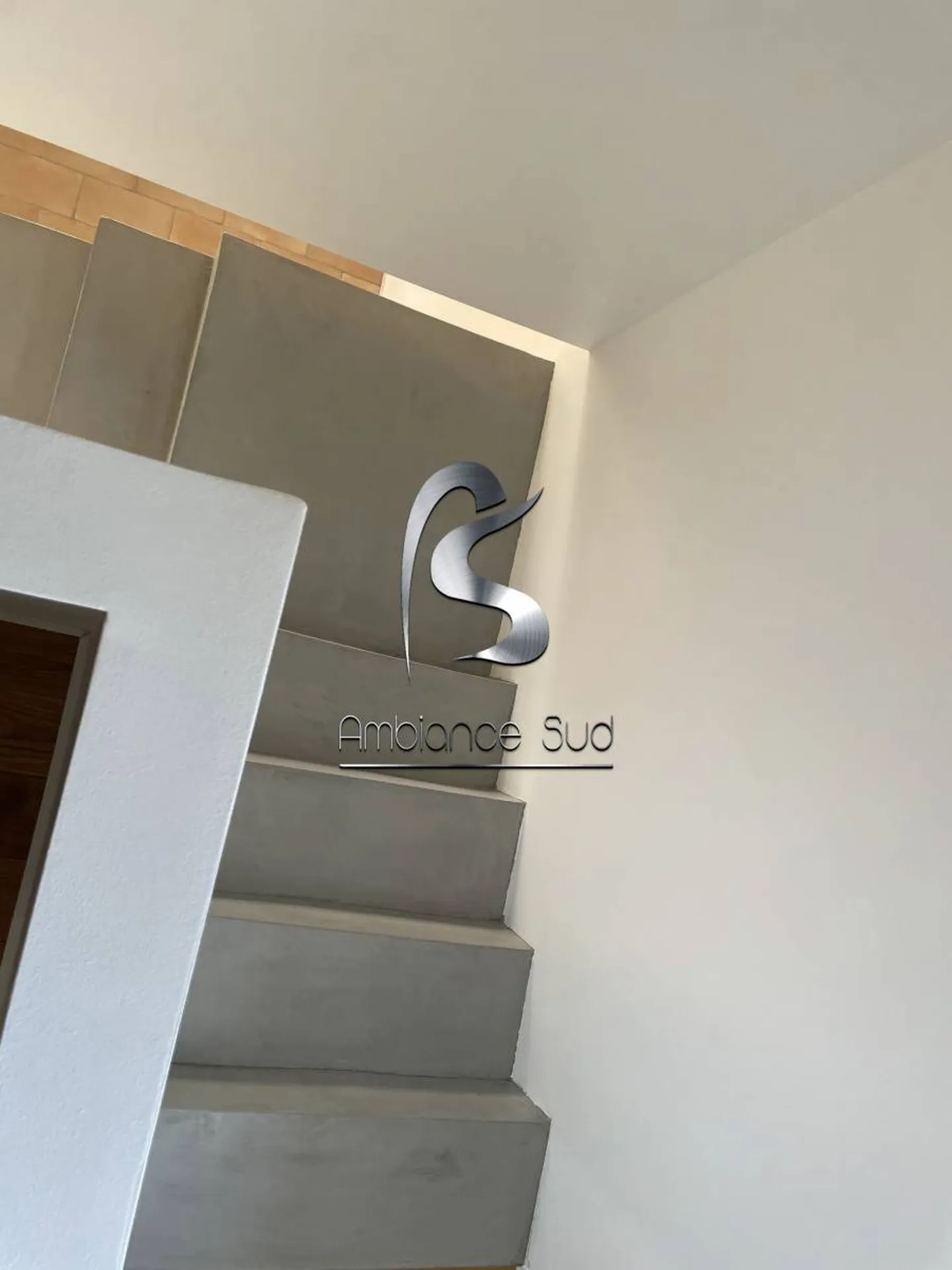Ambiance Sud vous fait découvrir la réalisation d'un escalier en béton ciré gris anthracite à l'intérieur d'une maison située à Cavalaire sur Mer.