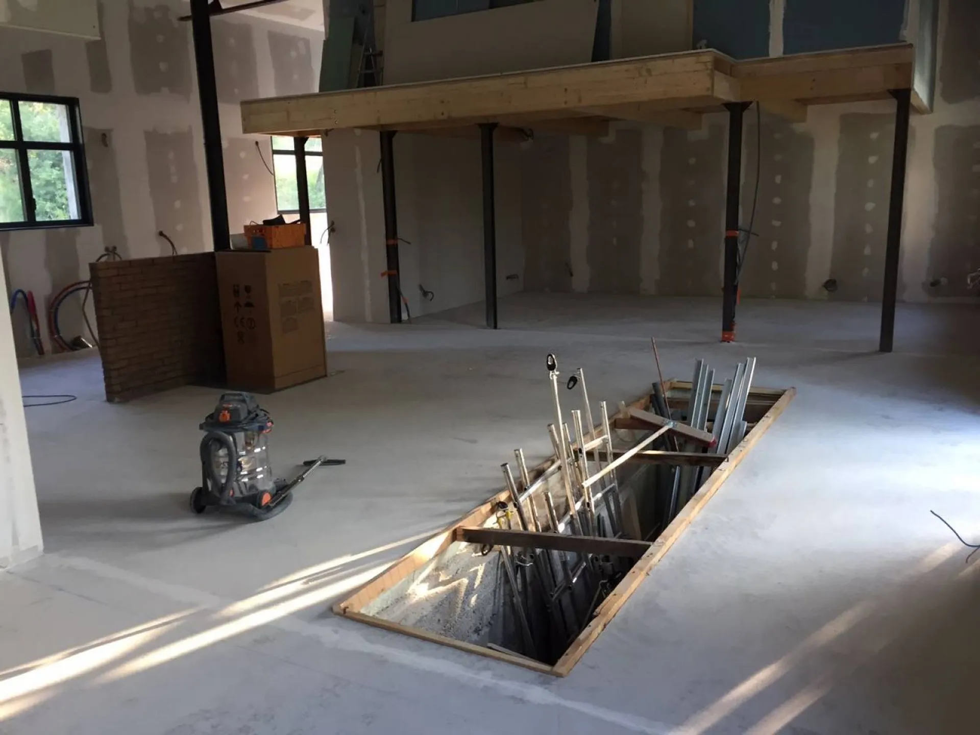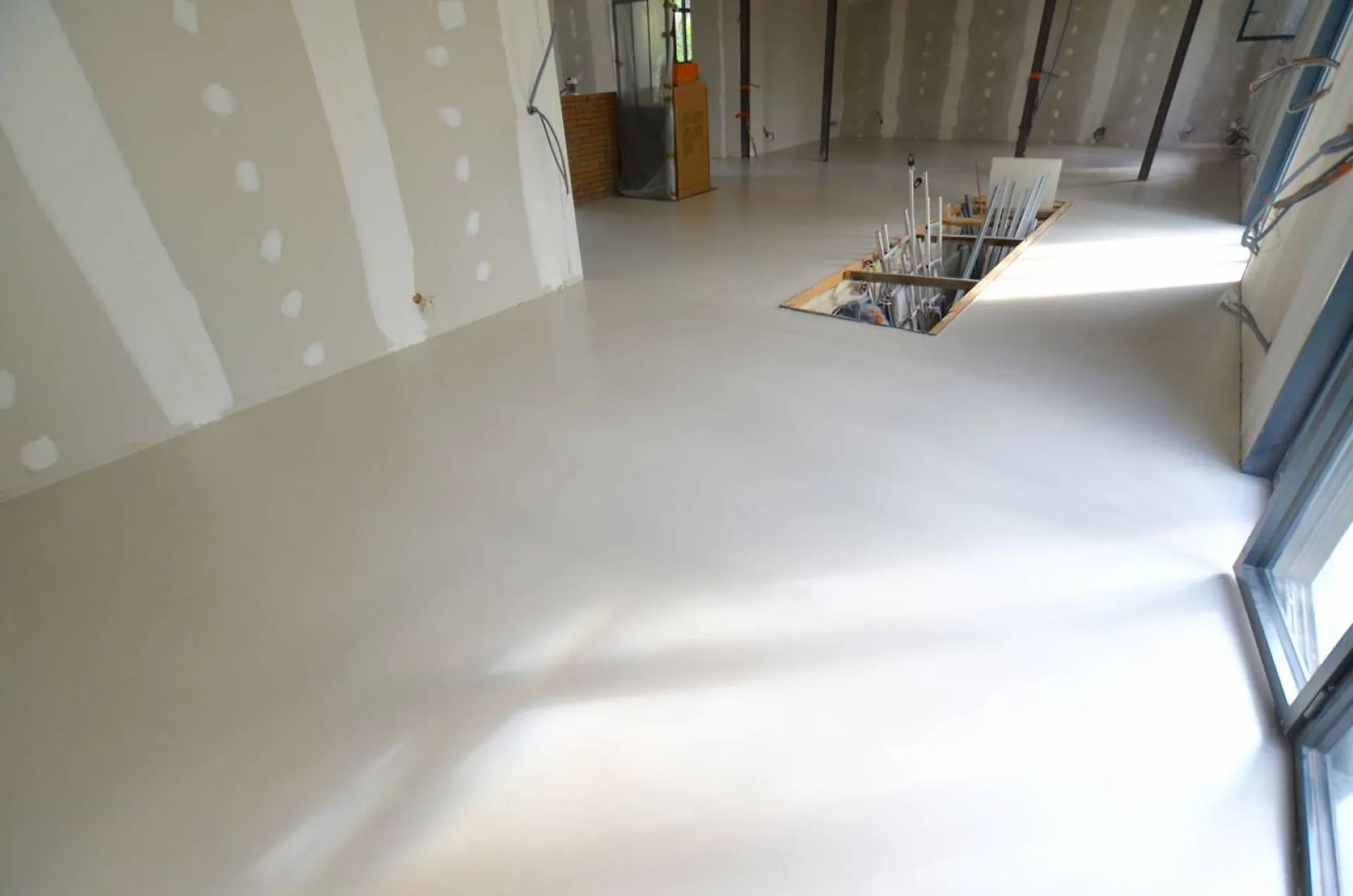 Ce béton cire coulé décoratif a été réaliser sur chape fluide ciment dans un ancien entrepôt transformé en loft. Ce produit industriel qui est une couche d'usure très costaud, normalement utilisé pour des usines,entrepôt, garages pour du grand passage , ressort esthétiquement bien pour un sol décoratif. D'une couleur gris clair de base, je l'ai blanchi pour arriver à un sol presque blanc avec une finition vernis semi mat.
