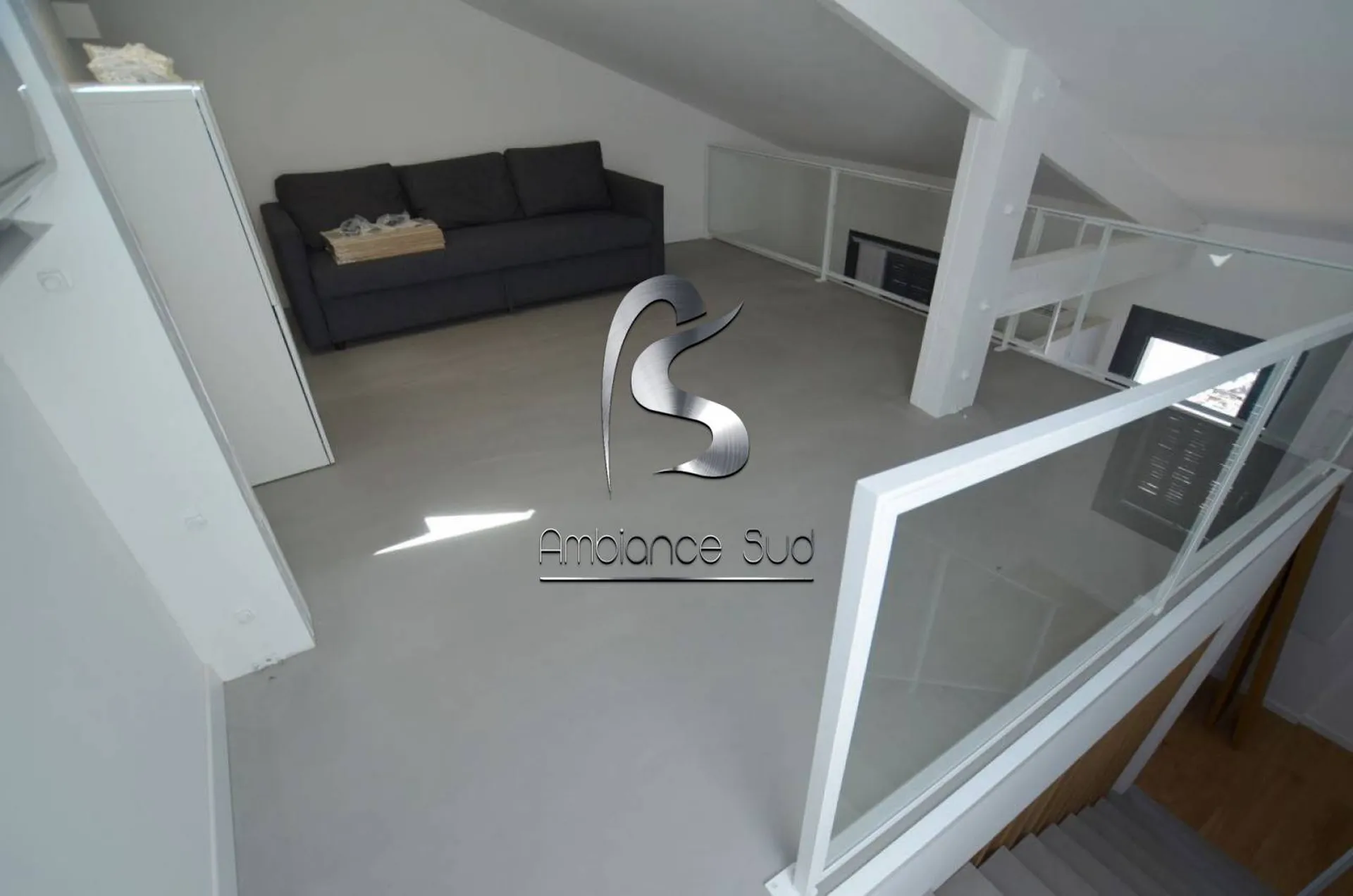 SOL EN BETON CIRE COULE DECORATIF A MARSEILLE 13AMBIANCE SUD a réalisé sur un sol d'une maison en rénovation en béton ciré coulé décoratif avec une chape mince fibré teinté de couleur gris clair sur