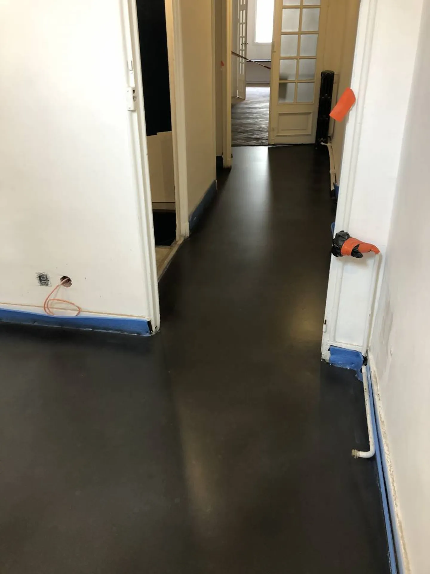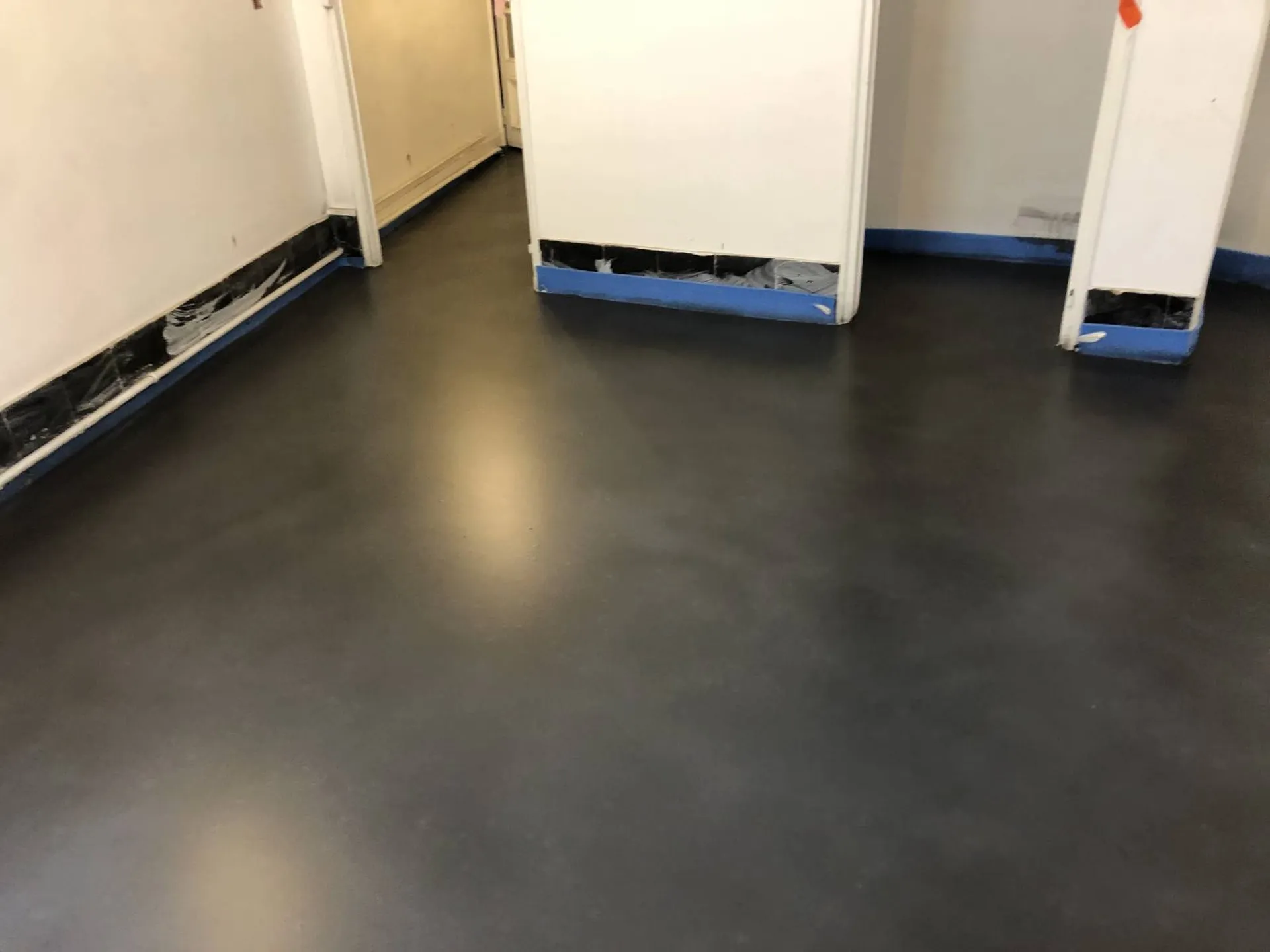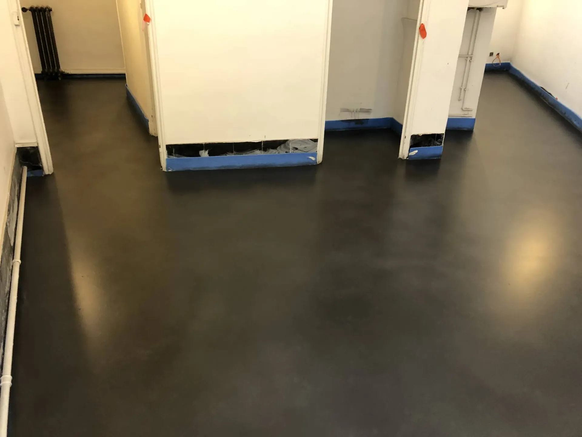 Pour ces clients, propriétaires d’une maison à rénover, nous avons effectué une application sur sol en béton ciré coulé noir.