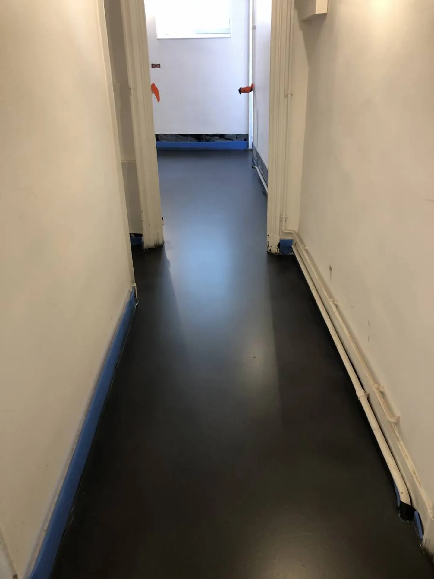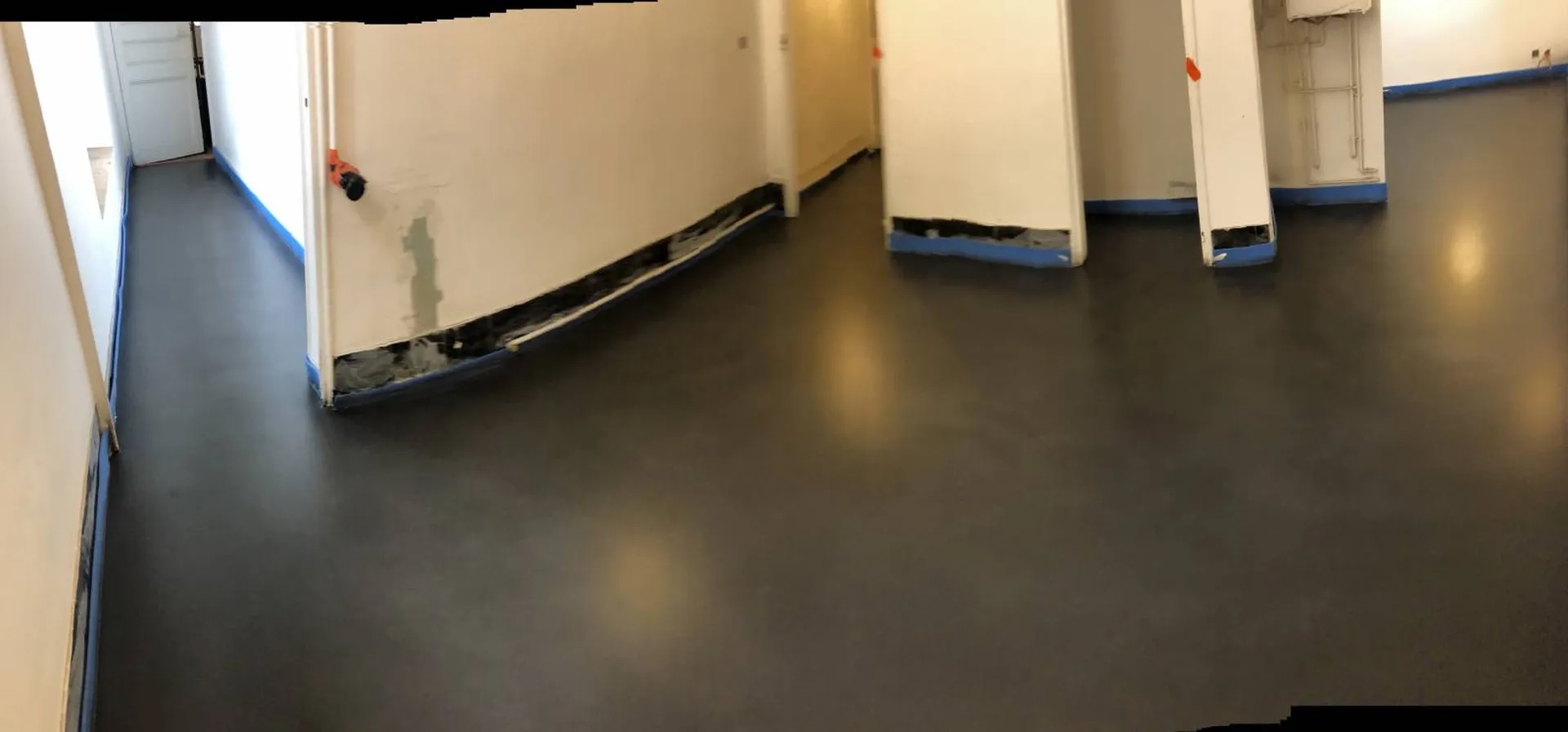 Nous avons d’abord enduit la chape sèche de 2 couches de primaires poreux puis nous avons coulé le béton ciré de couleur G80.