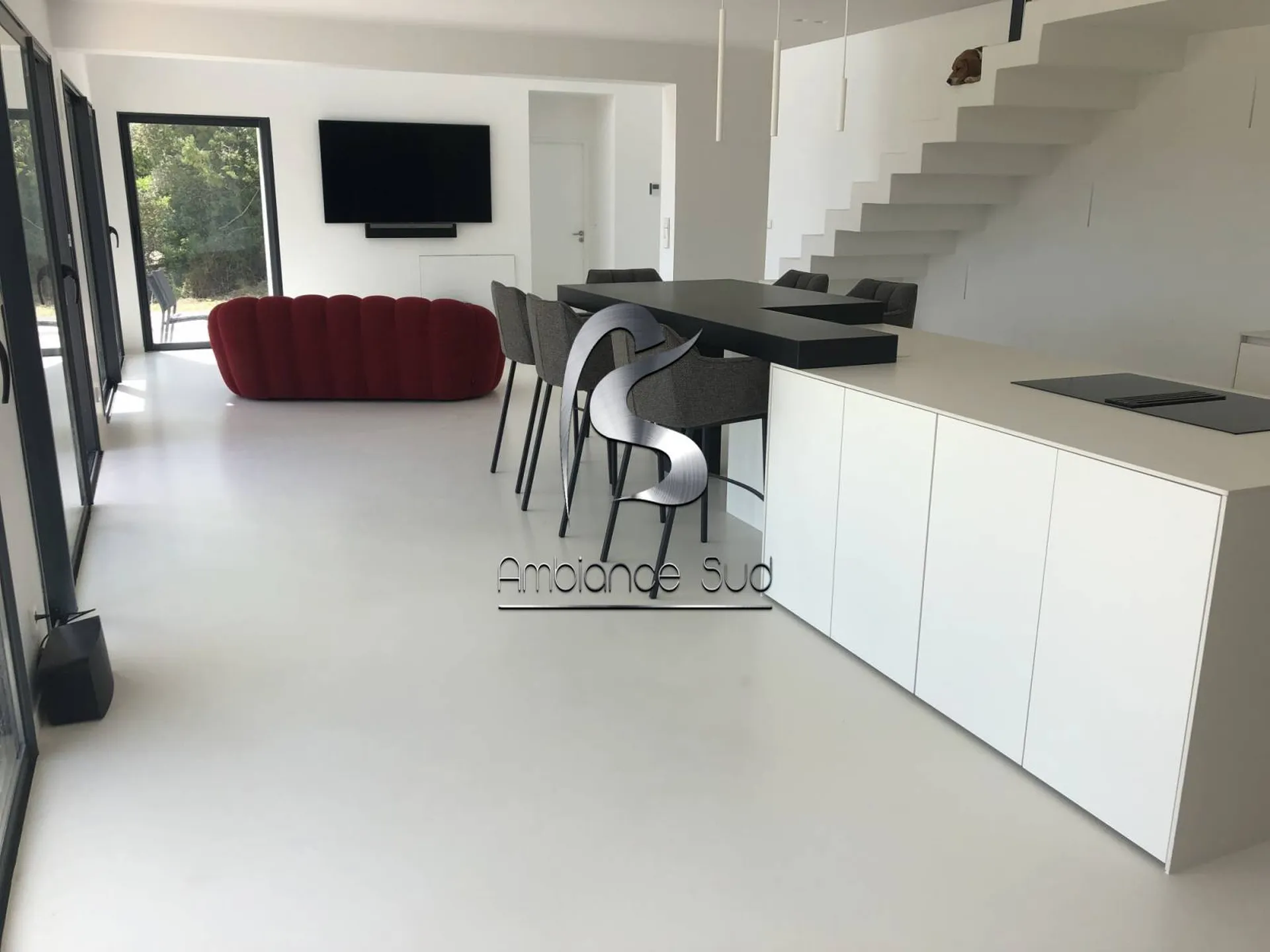 POSE D'UN BETON CIRE TALOCHE SUR CHAPE ANHYDRITE D'UNE MAISON NEUVE SUR LES HAUTEUR DE CASSIS 13 :Pour cette maison située à CASSIS, AMBIANCE SUD a utilisé le béton ciré taloché en 3 passes avec 3 couches de vernis et faisant des préparations différ...